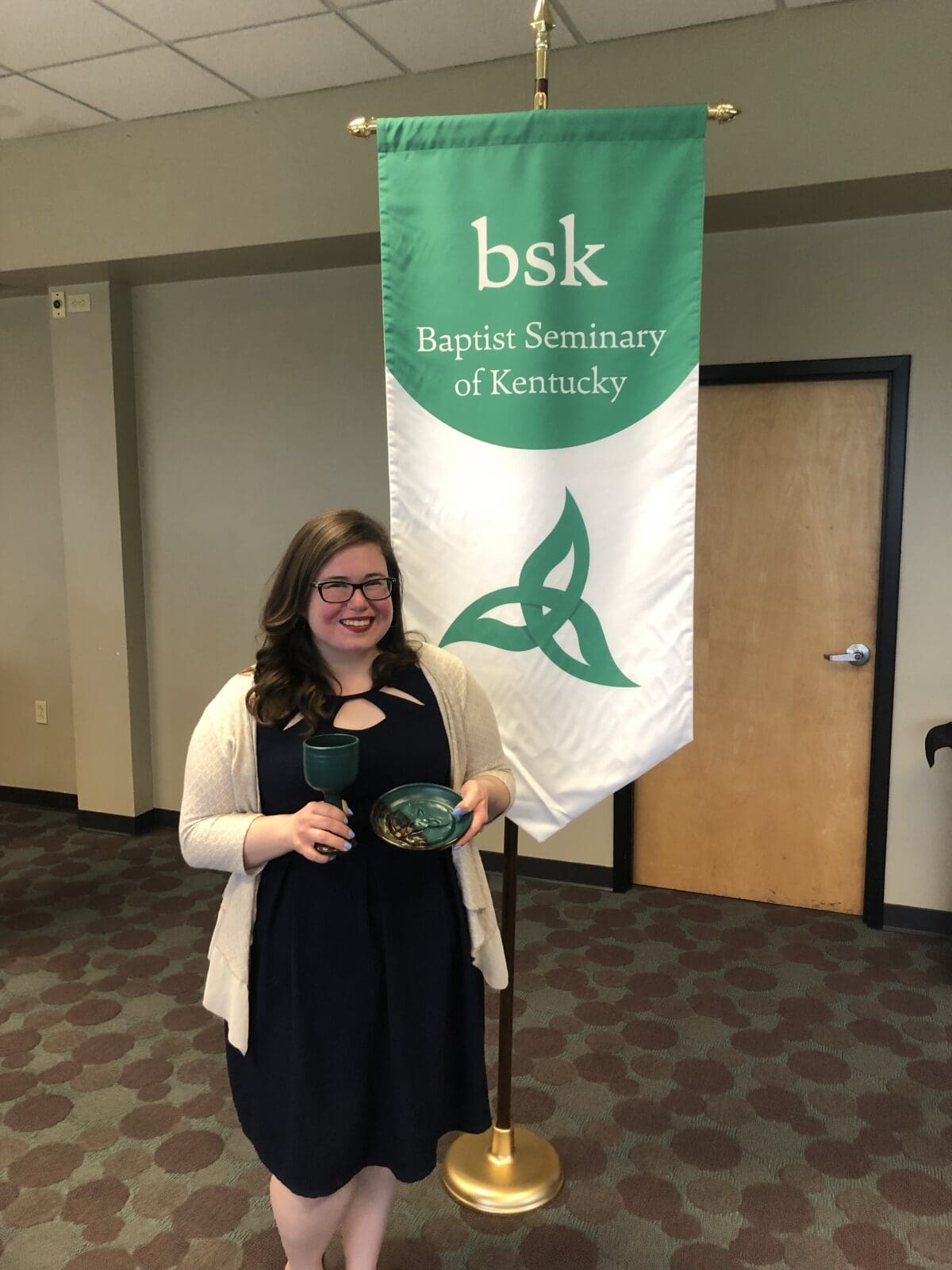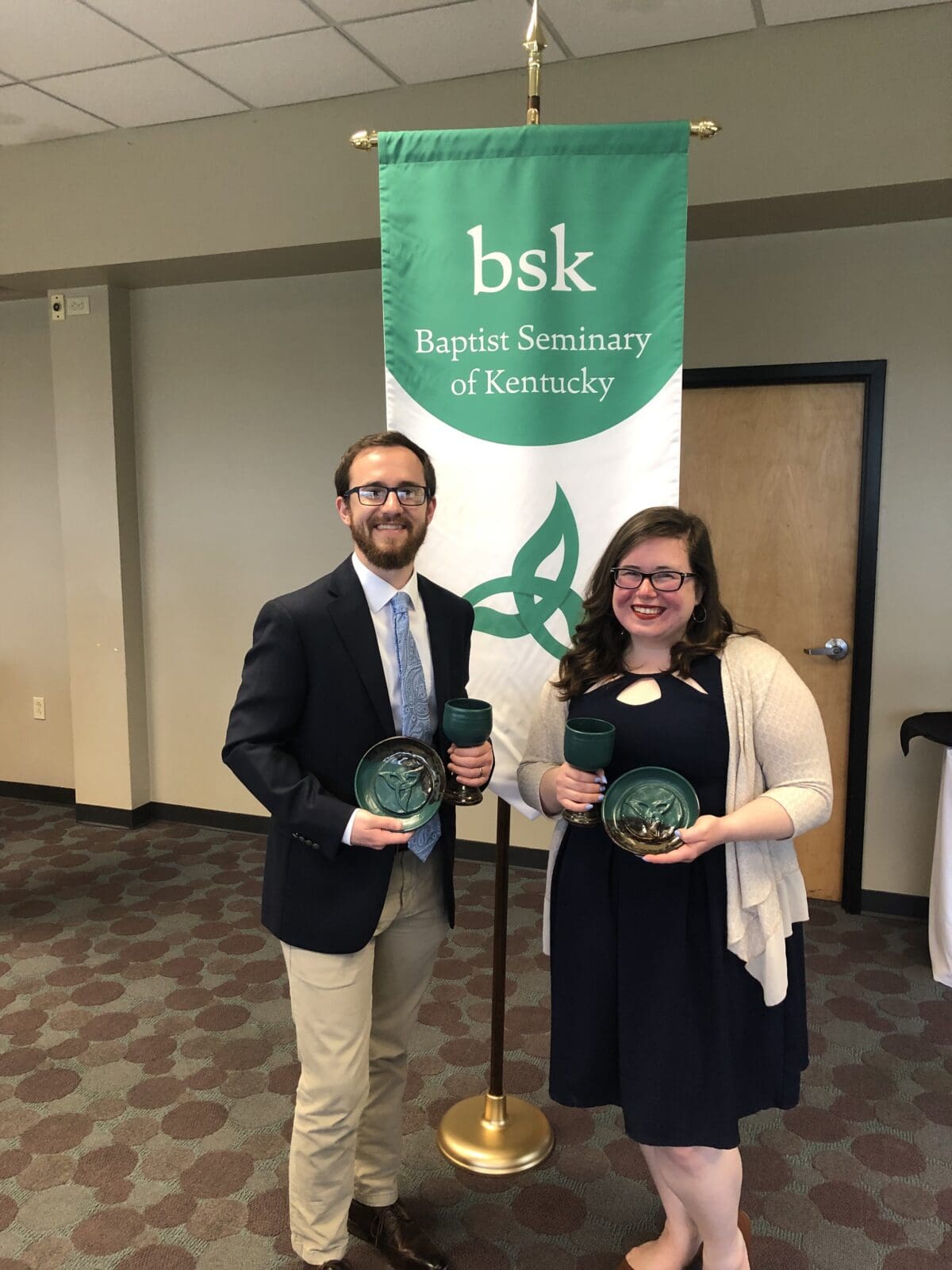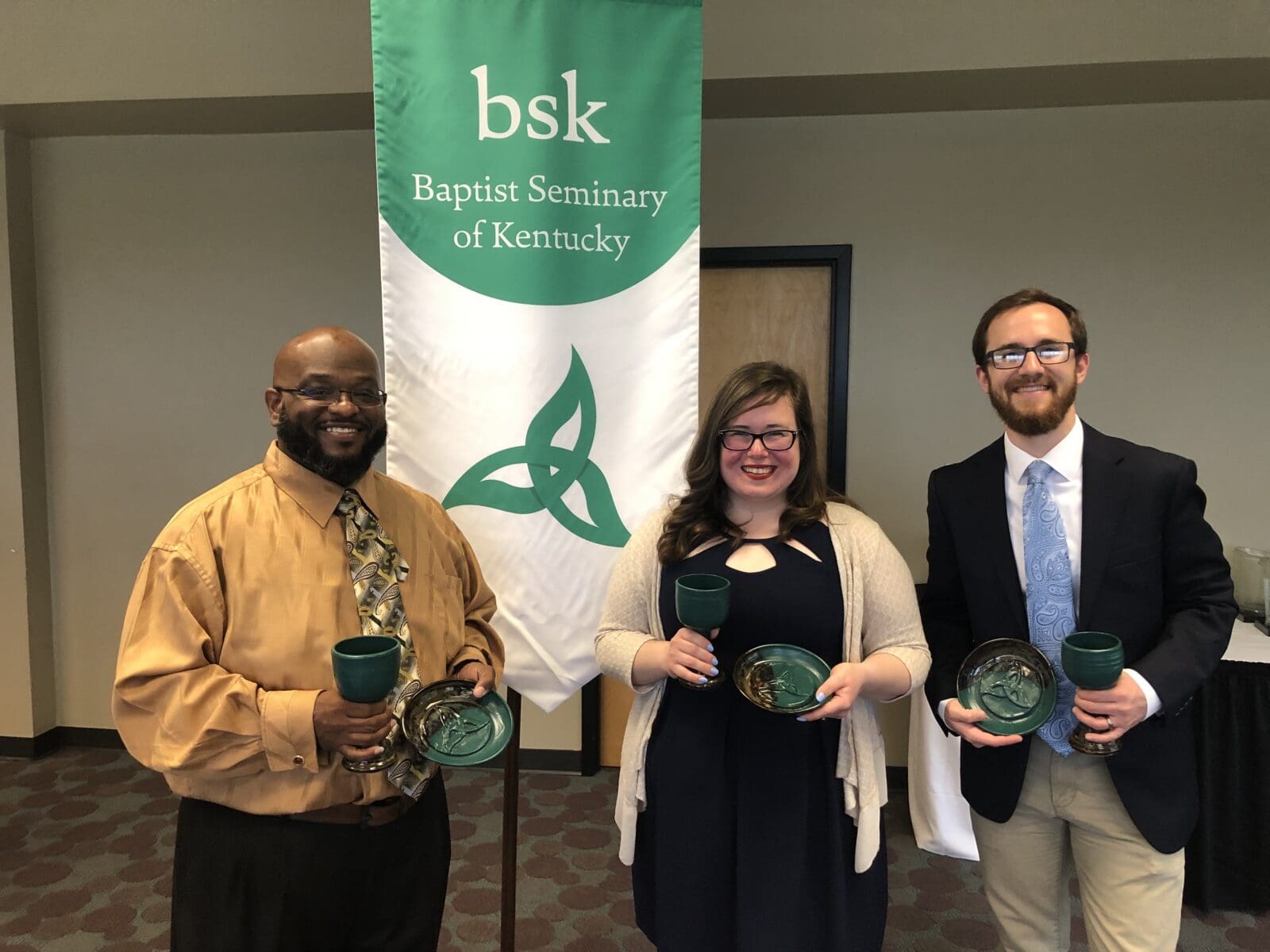 On May 10, 2019, the evening before our annual Commencement ceremony, we honored our graduates at our Graduates Banquet. At this special event, our graduates and their families gathered with BSK faculty and staff to celebrate over dinner. Following the meal, Dr. John Inscore Essick shared words about each of the graduates and the role they have played at BSK. The remainder of the program included a poem shared by Rev. Amber Inscore Essick and the gifting of the chalice and paten to the graduates, introduced by Dr. Mark Medley. The chalice and paten set that the graduates were gifted were handmade and included an imprint of a triquetra, a trinitarian symbol that is a part of BSK’s logo. Darrell Pittman, one of BSK’s graduates, was not able to be at the banquet because he was at a CD release party for his recently released album! Our graduates continue to use their degrees in creative ways and we are so proud of them! Congratulations, grads!