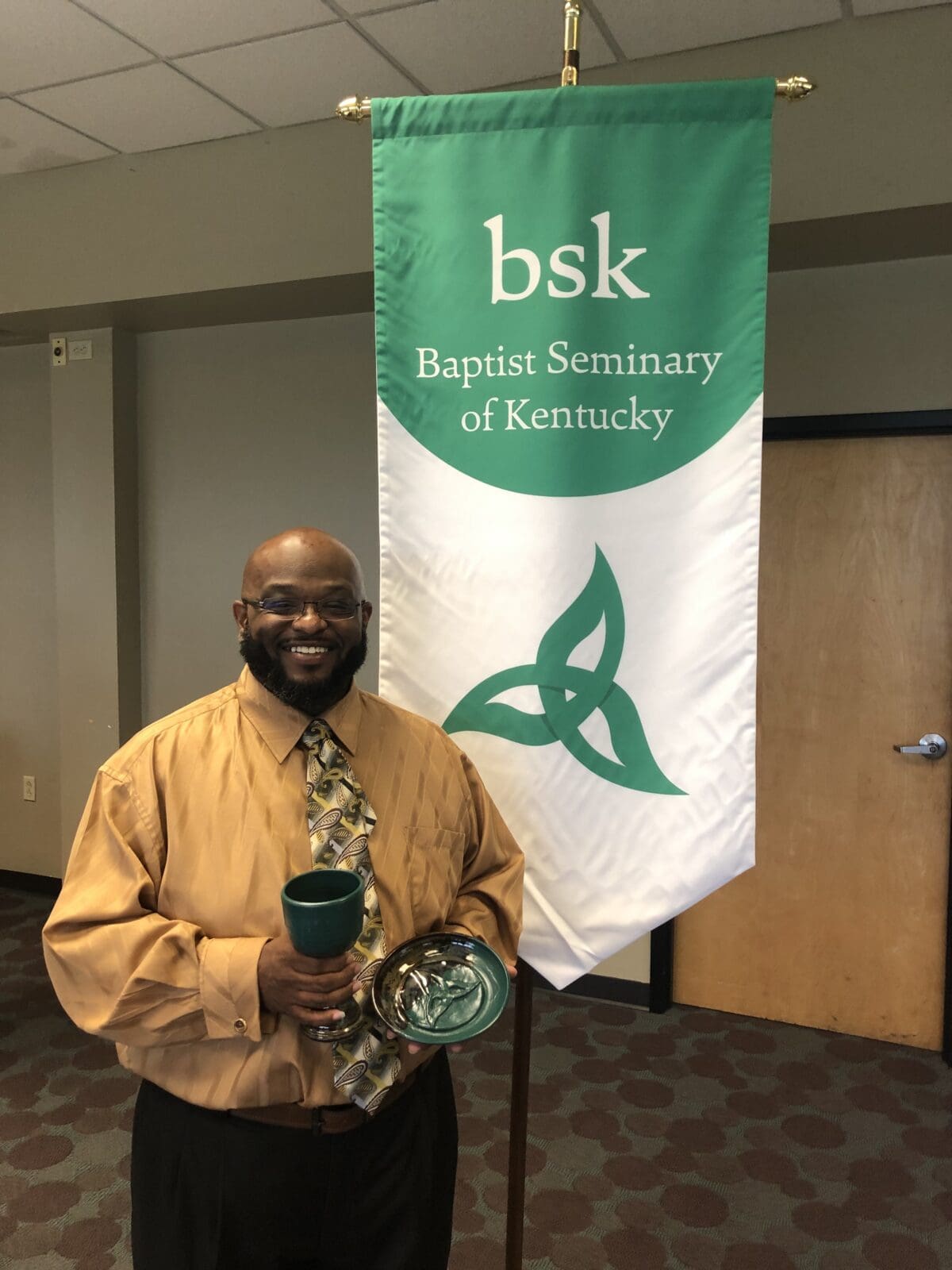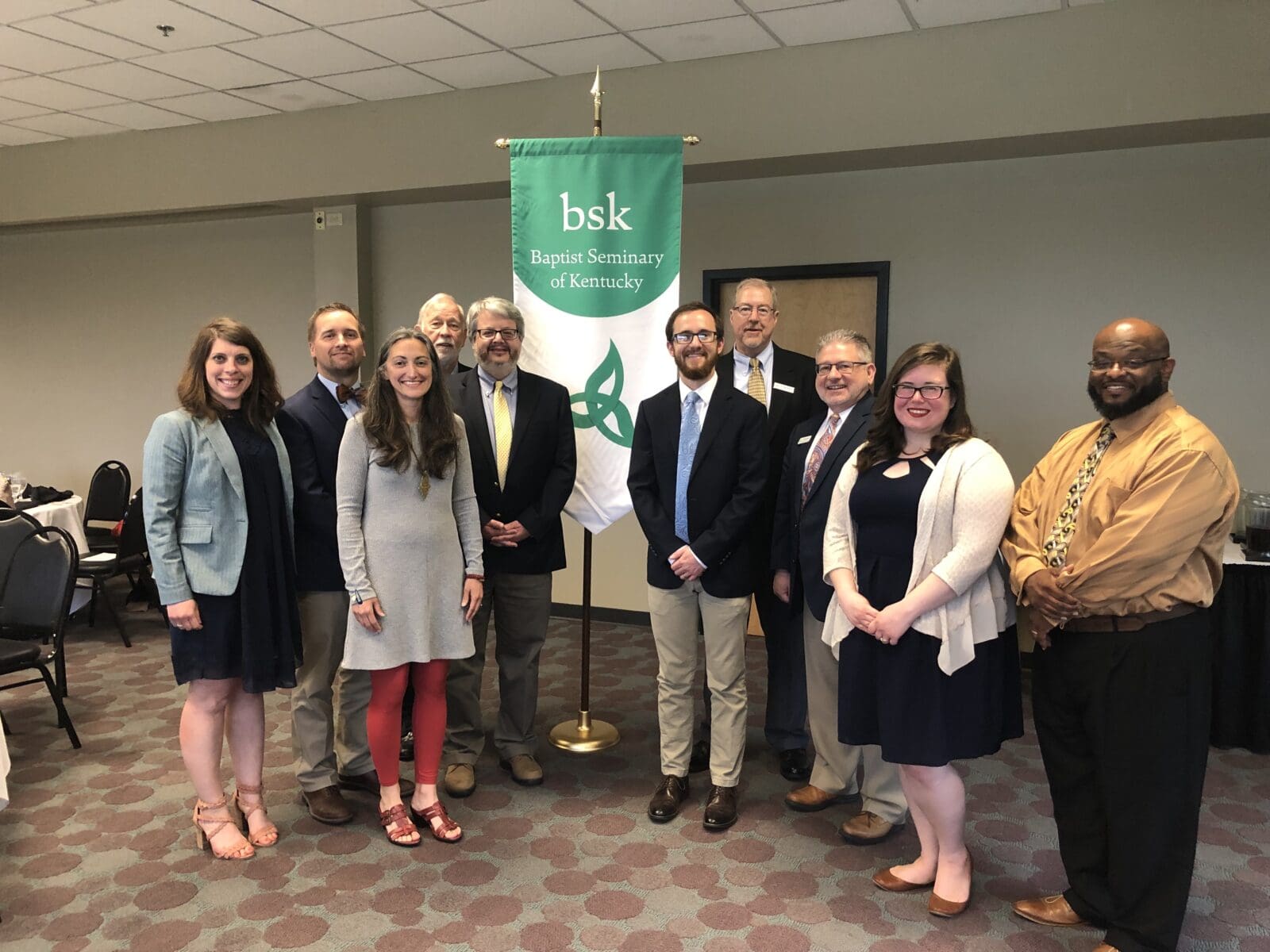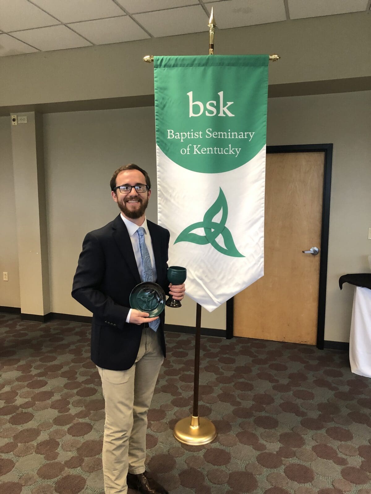 On May 10, 2019, the evening before our annual Commencement ceremony, we honored our graduates at our Graduates Banquet. At this special event, our graduates and their families gathered with BSK faculty and staff to celebrate over dinner. Following the meal, Dr. John Inscore Essick shared words about each of the graduates and the role they have played at BSK. The remainder of the program included a poem shared by Rev. Amber Inscore Essick and the gifting of the chalice and paten to the graduates, introduced by Dr. Mark Medley. The chalice and paten set that the graduates were gifted were handmade and included an imprint of a triquetra, a trinitarian symbol that is a part of BSK’s logo. Darrell Pittman, one of BSK’s graduates, was not able to be at the banquet because he was at a CD release party for his recently released album! Our graduates continue to use their degrees in creative ways and we are so proud of them! Congratulations, grads!